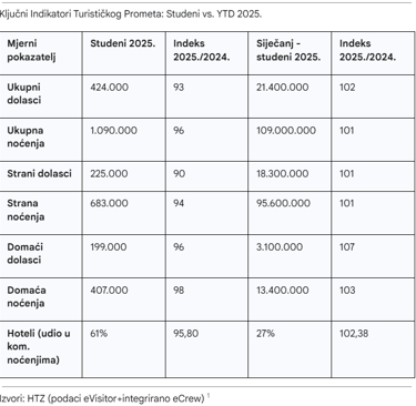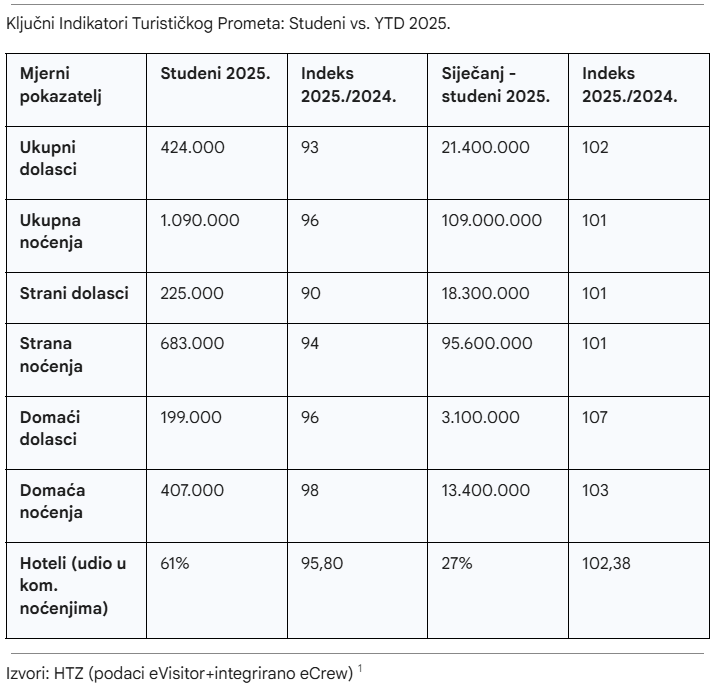 Statistički pokazatelji za 2025. godinu do studenog potvrđuju nastavak trenda stabilnog rasta, ali rezultati za studeni služe kao upozorenje glede ranjivosti sektora izvan glavne sezone.